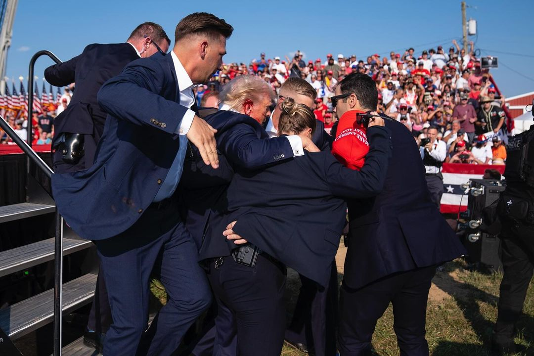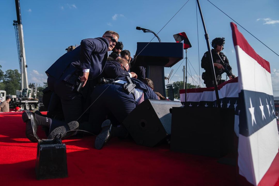 El fotógrafo mira hacia arriba con su cámara logrando que Trump aparezca elevado como figura central de la escena mientras agentes del Servicio Secreto, con su característico traje negro, lo protegen formando una composición triangular que deja al expresidente en el vértice.